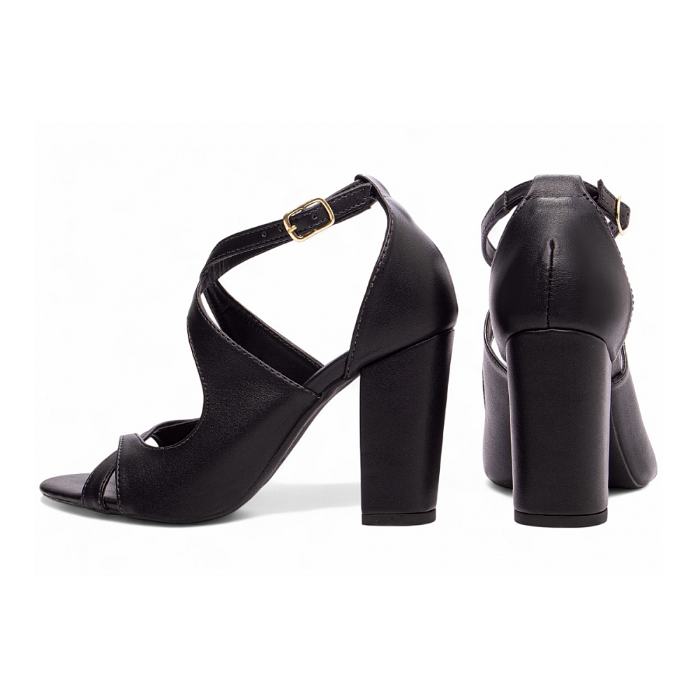 Material: Napa Preto; Palmilha: Confort com 8 mm de Espessura, Espuma em EVA, Revestida com Napa Preto e Taloneira em Napa Preto; Enfeite: Fivela de Ajuste na Cor Dourado; Forro: Sintético na cor Preto; Salto: 8,5 cm de altura Revestido em Napa Preto; Solado de PVC antiderrapante na cor Preto.