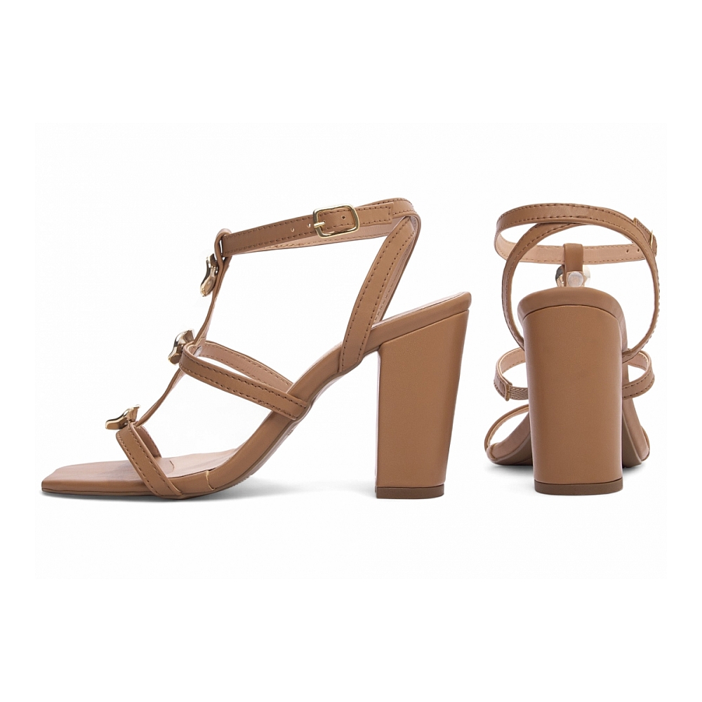 Material: Napa Caramelo; Enfeite: Apliques em ABS na cor Dourado e Fivela de Ajuste na Cor Dourado; Palmilha: 8 mm de Espessura, Espuma em EVA, Revestida em Napa Caramelo e Taloneira Napa Bege; Salto: Grosso com 9 cm de Altura Revestido em Napa Caramelo; Solado de TR com antiderrapante na cor Bege.