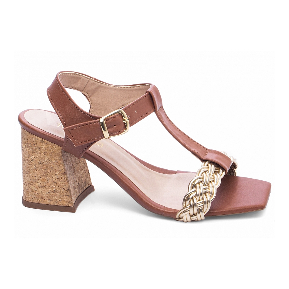 — Material: Napa Caramelo e Trança Napa Dourado; Enfeite: Fivela de Ajuste na cor Dourado; Palmilha: 8 mm de Espessura, Espuma em EVA, Revestida em Napa Caramelo e Taloneira Napa Bege; Salto: Grosso com 7 cm de Altura Revestido em Cortiça; Solado de PVC com antiderrapante na cor Bege.