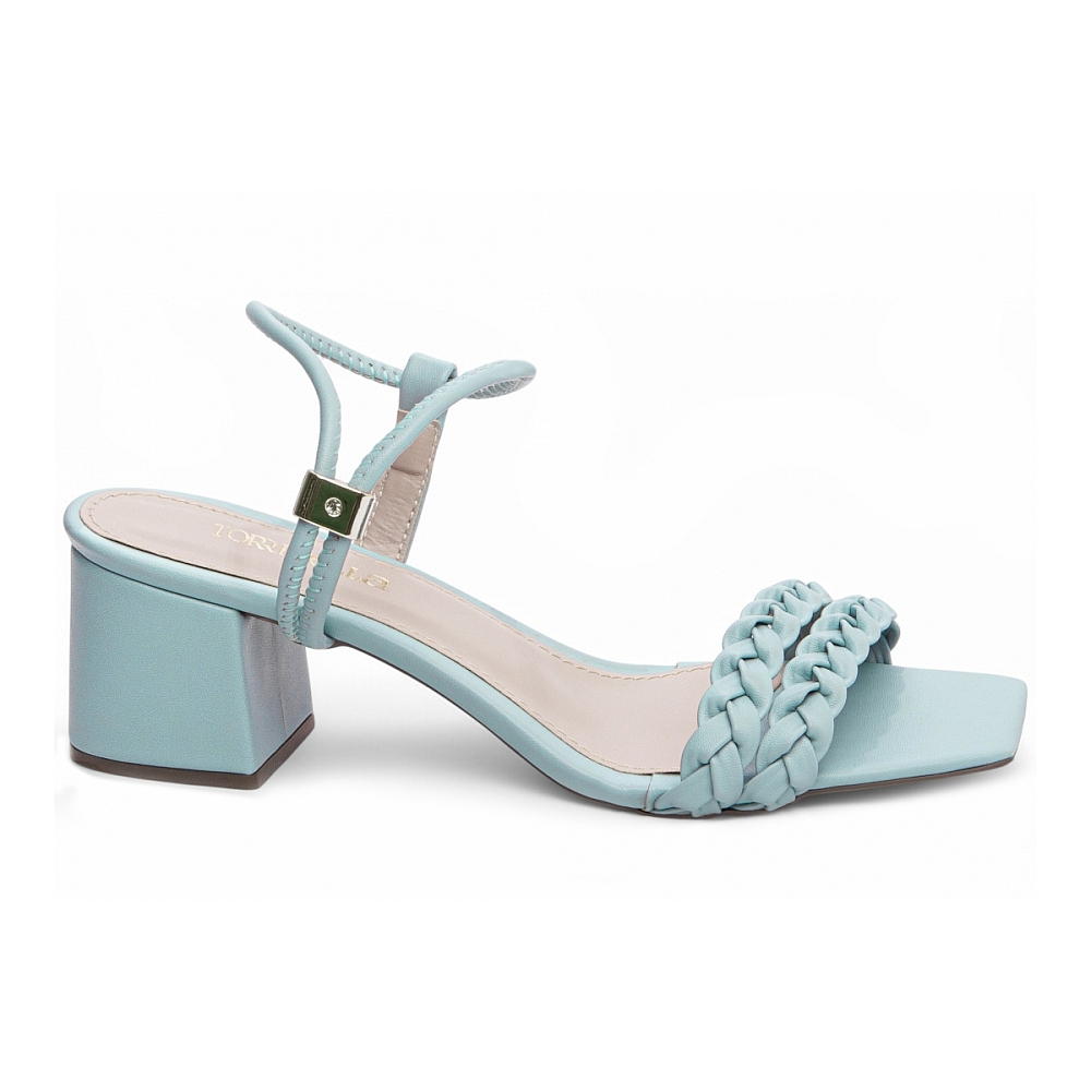 Material: Napa Azul; Enfeite: Peça em ABS para ajuste; Palmilha: 8 mm de Espessura, Espuma em EVA, Revestida em Napa Azul e Taloneira Napa Bege; Salto: Grosso com 5,5 cm de Altura Revestido em Napa Azul; Solado de TR com antiderrapante na cor Bege.