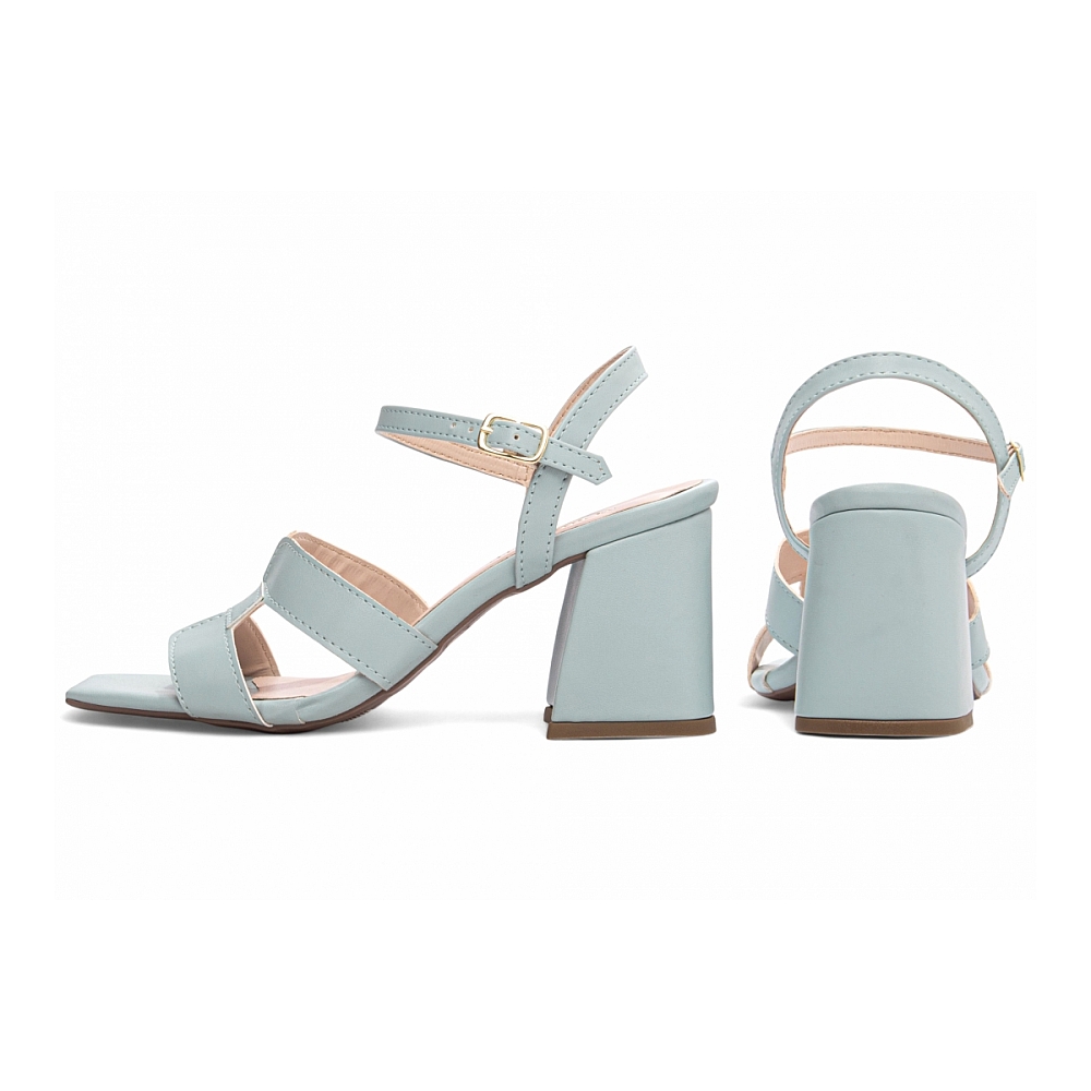 Material: Napa Azul; Enfeite: Fivela de Ajuste na cor Dourado; Palmilha: 8 mm de Espessura, Espuma em EVA, Revestida em Napa Azul e Taloneira Napa Bege; Salto: Grosso com 7 cm de Altura Revestido em Napa Azul; Solado de PVC com antiderrapante na cor Bege.