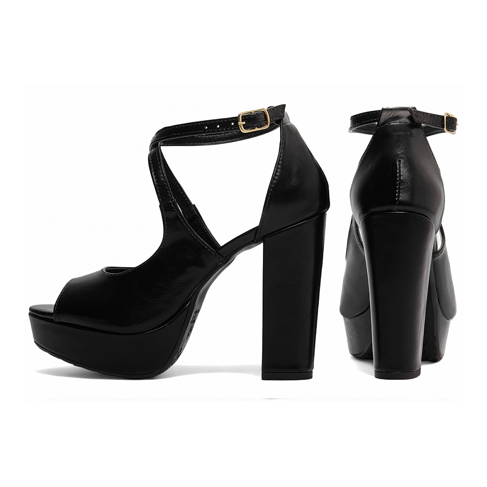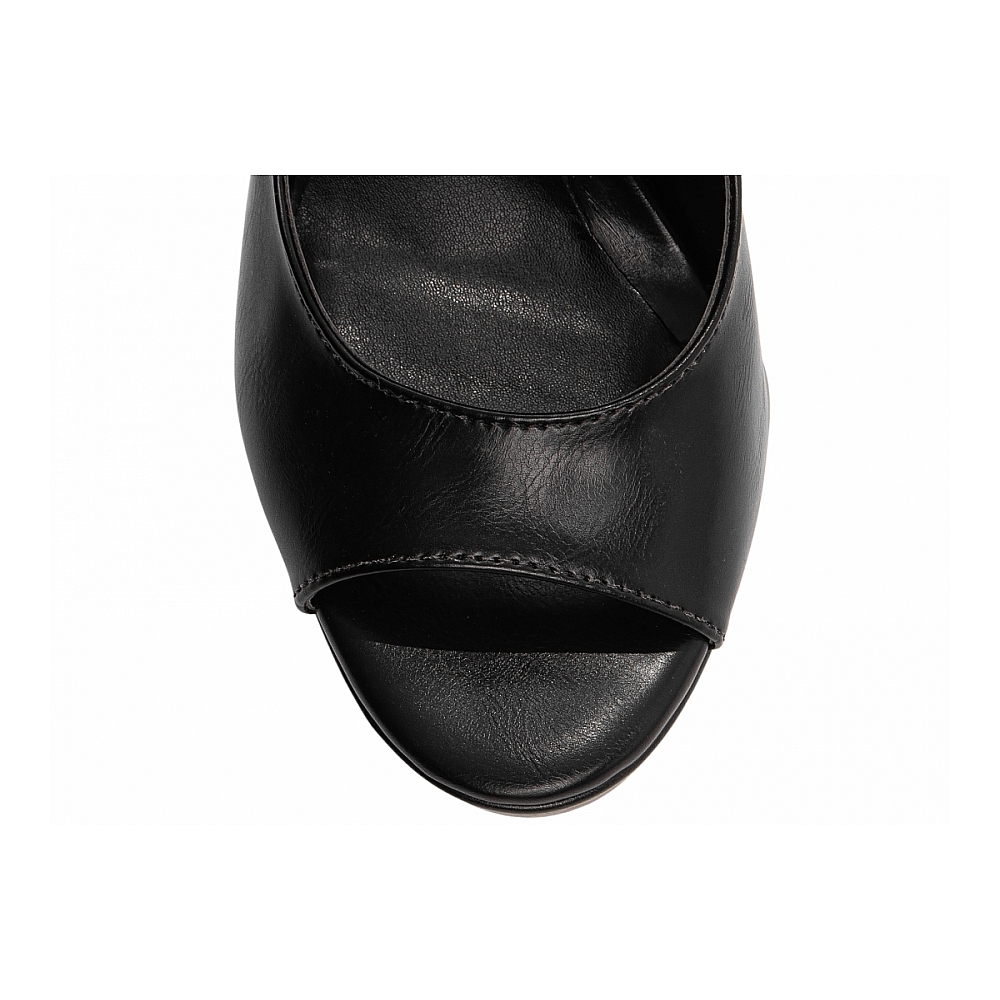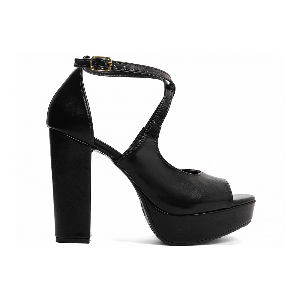 Material: Napa Preto; Enfeites: Fivela de Ajuste na cor Dourado; Palmilha: 8 mm de Espessura, Espuma em EVA, Revestida em Napa Preto e Taloneira Napa Preto; Meia Pata: Revestida em Napa Preto com 3,5 cm de altura; Salto: Bloco com 11 cm de Altura Revestido em Napa Preto; Solado de TR com antiderrapante na cor Preto.