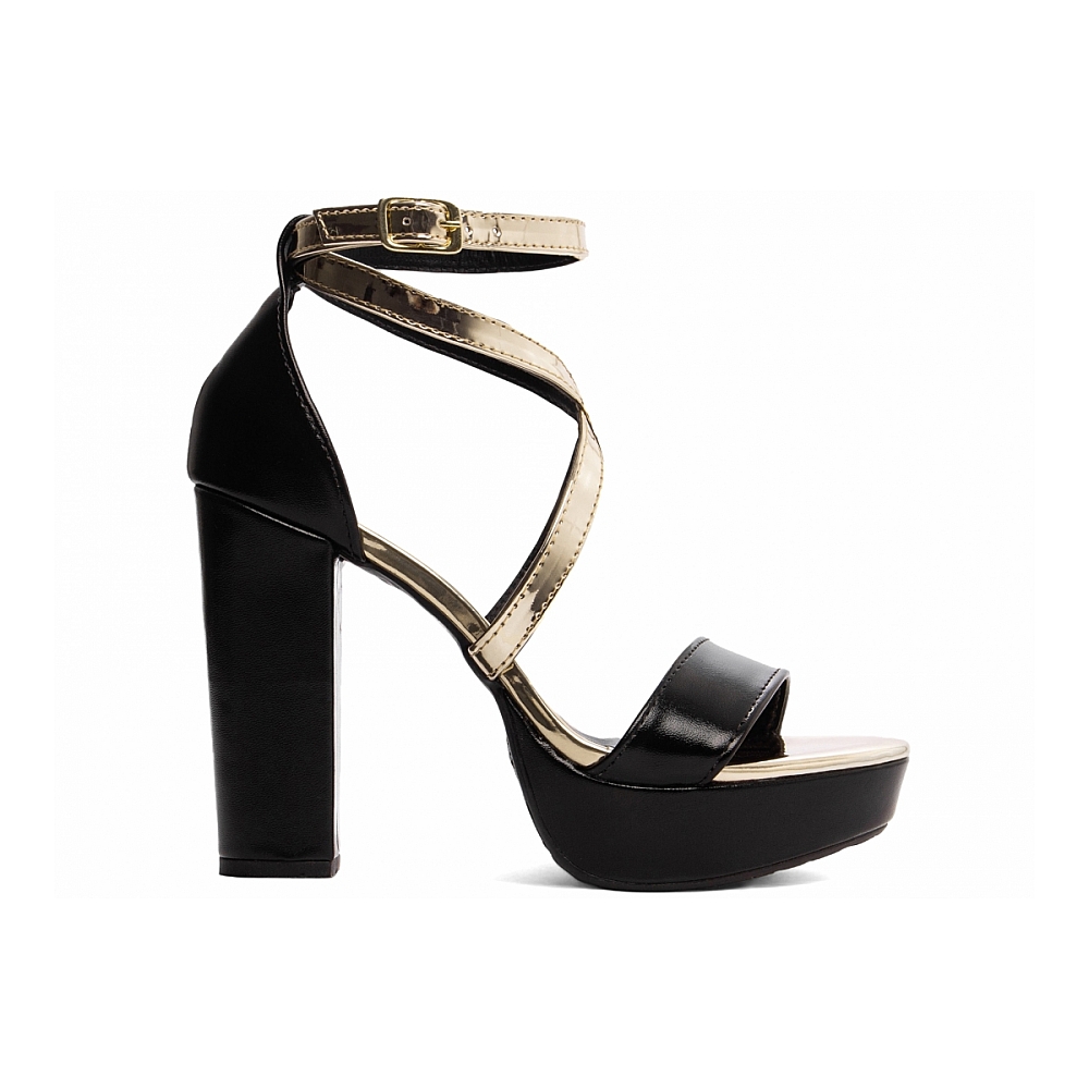 Palmilha: 8 mm de Espessura, Espuma em EVA, Revestida em Verniz Metalizado Specchio Ouro Light e Taloneira Napa Preto;