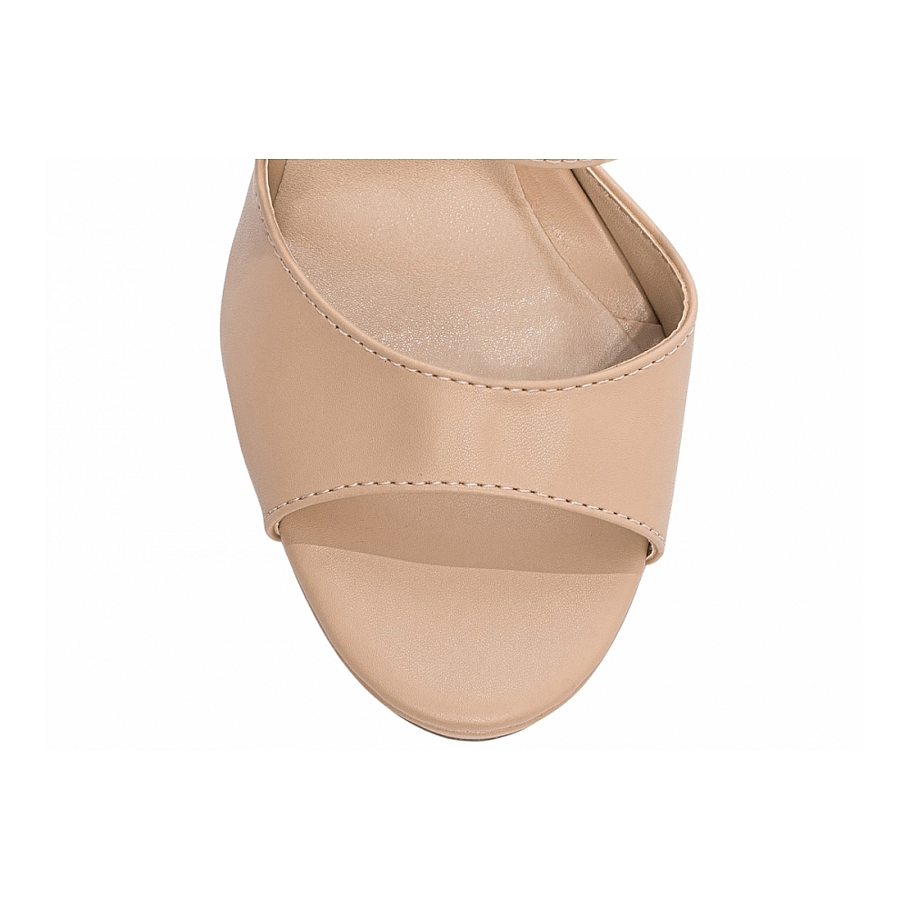Material: Napa Bege; Enfeites: Fivela de Ajuste na cor Dourado; Palmilha: 8 mm de Espessura, Espuma em EVA, Revestida em Napa Bege e Taloneira Napa Bege; Meia Pata: Revestida em Napa Bege com 3,5 cm de altura; Salto: Bloco com 11 cm de Altura Revestido em Napa Bege; Solado de TR com antiderrapante na cor Bege.