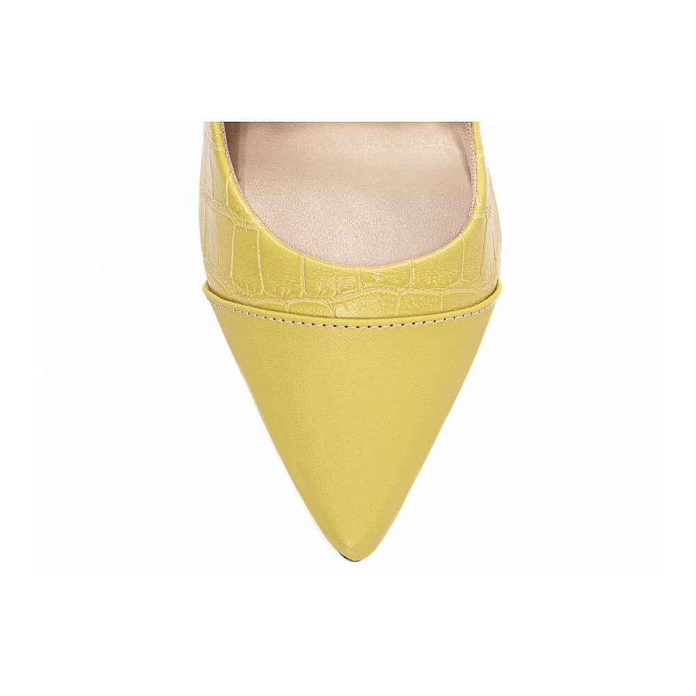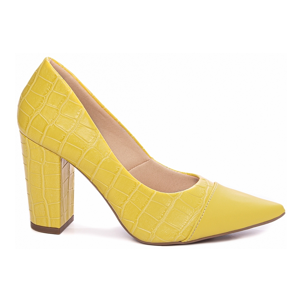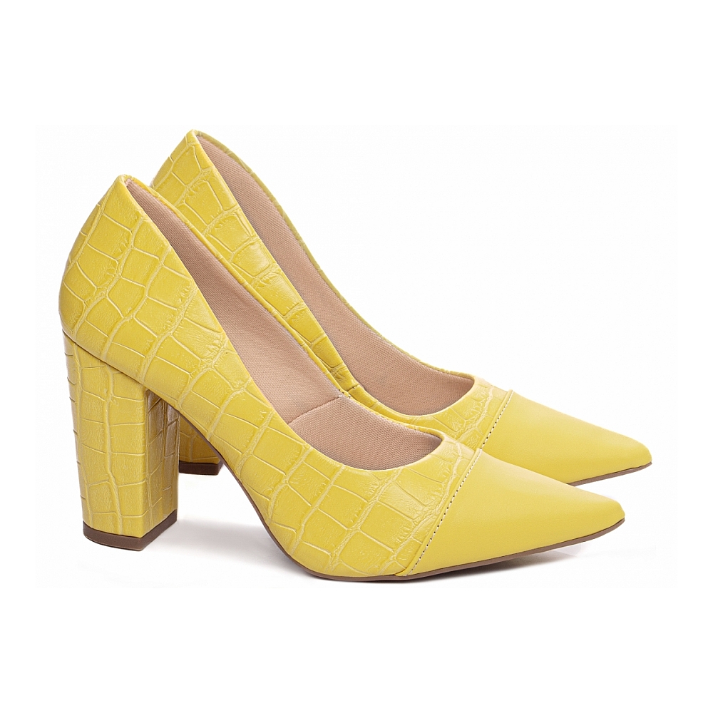 Salto: Grosso com 9 cm de Altura Revestido em Croco Amarelo;