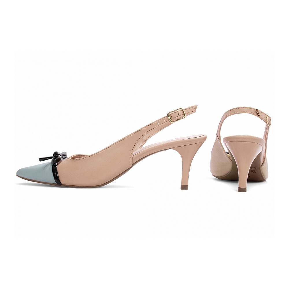 Material: Napa Azul e Napa Bege; Enfeite: Fivela de ajuste na cor Dourado e Laço em Verniz Preto; Forro: Sintético na cor Bege; Palmilha: 8 mm de Espessura, Espuma em EVA, Revestida em Napa Bege e Taloneira Napa Bege; Salto: Fino com 6 cm de Altura Pintado na Cor Bege; Solado de PVC com antiderrapante na cor Bege.